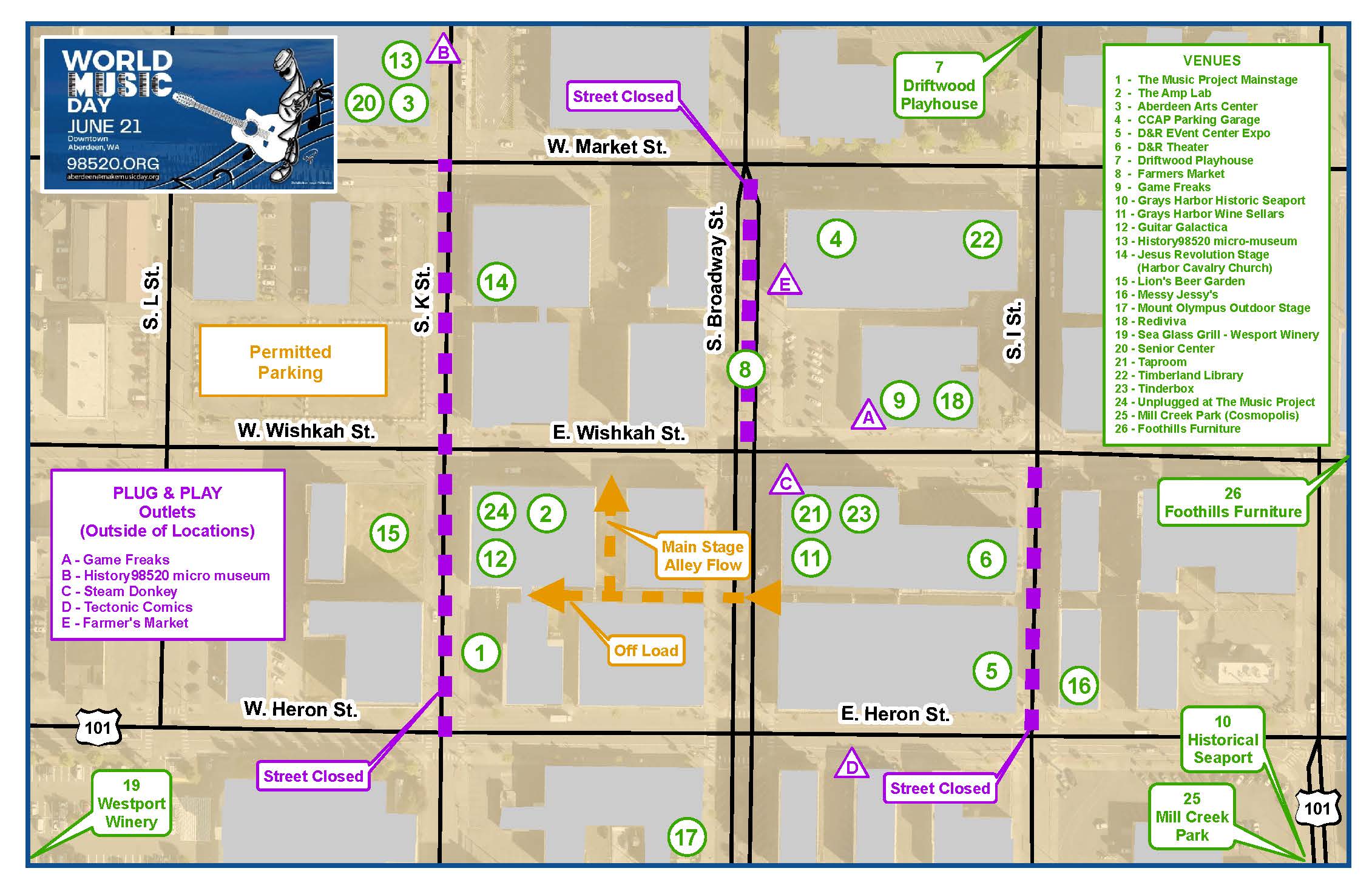 Please use 121 W Wishkah St, Aberdeen, WA, 98520 as your waypoint as it will direct you into the heart of the festival.
